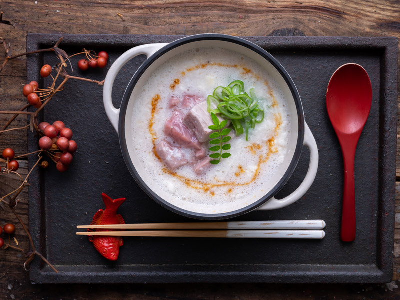飾り用の長ネギをのせ、お好みでしょうゆをかけてできあがり。