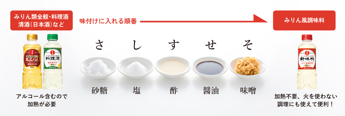 「みりん」や「料理酒」は「さしすせそ」と一緒に使うことで、普段の料理を一層美味しく仕上げます。