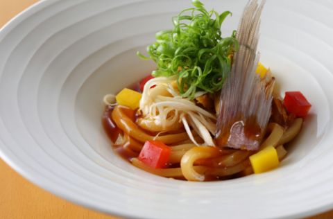 - 鍋に合わせ出汁を入れて沸騰させて、鶏肉・季節の野菜の千切りを順に入れて煮込む。