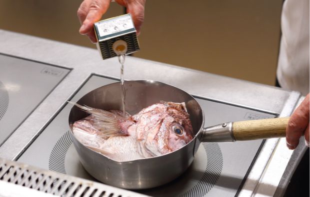 - 全体に焼目がつき芯まで火が入れば、仕上げに純米料理清酒で香りとコクをつけるようにフランベする。